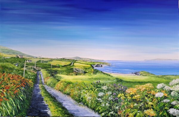 One of my favourite views on Sherkin, where the road stretches west into the distance above Traban beach,and out past Sleivemore. Wild flowers line the road side, and in the distance past the headland, lies Cape Clear. It’s such a wide open expansive view and I wanted to paint it big, so I chose a good size canvas, making this is a substantial and strong art piece.